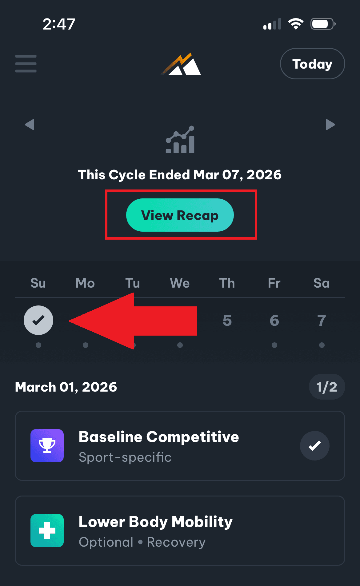 To view past workout recaps, select the workout you want to view and simply tap the “View Recap” button at the top of the weekly dashboard.